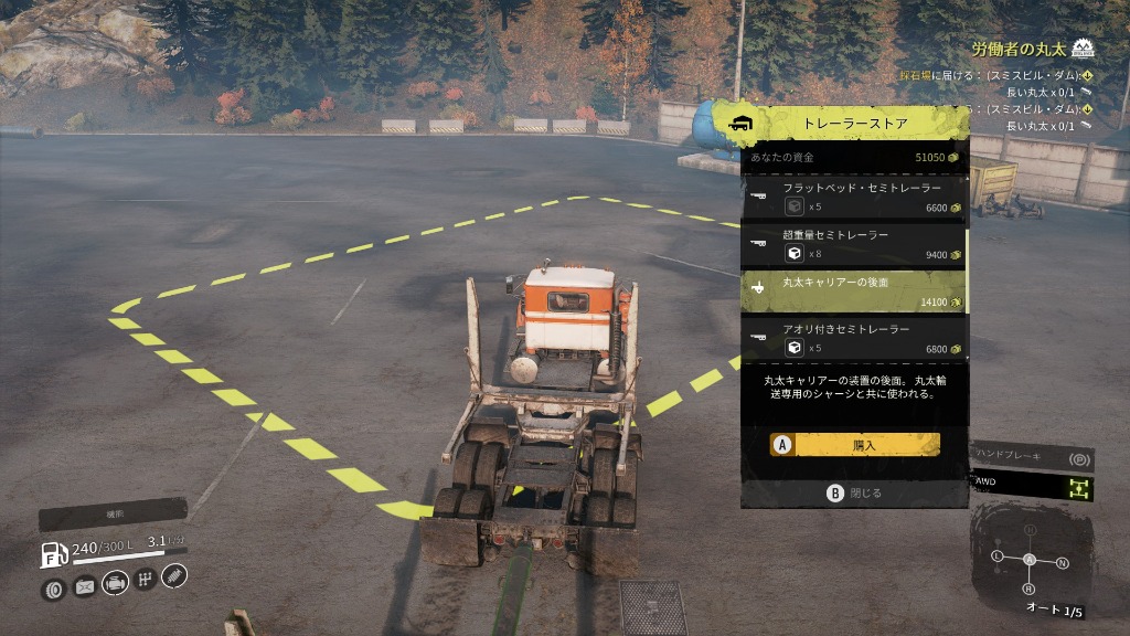 Snow Runnerで、長い丸太を運ぶときは、丸太キャリアーの前面をカスタマイズで装備しておいて、トレーラーストアで、丸太キャリアーの後面を購入する。注意しなけきゃいけないのは、トレーラーストアで、丸太トレーラーってのがあるけど、そちらだと長い丸太が運べない。